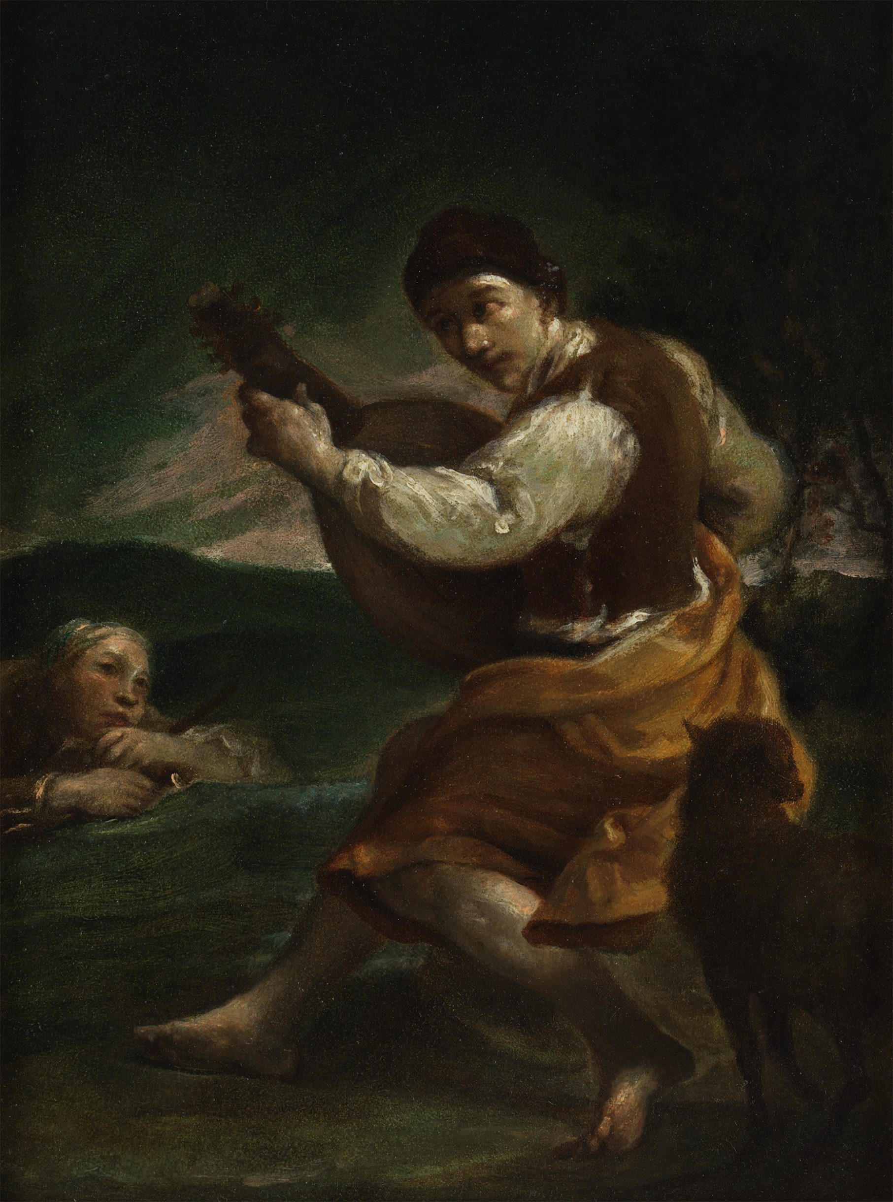 The present work has Crespi’s typical painterly handling which in this case ultimately derives from the later work of Titian in Venice, a city Crespi had visited. The mysterious stormy atmosphere is also north Italian and recalls the sixteenth century Ferrarese school, for example the Apollo as a Musician with Daphne by Dosso Dossi in the Galleria Borghese, Rome. The rapt gaze of the boy to the left is particularly striking as is the intensity of the lute player as he braces himself to play. Both figures are young or youngish, adding a didactic message that mastery of a musical instrument is best undertaken at an early age. ❖