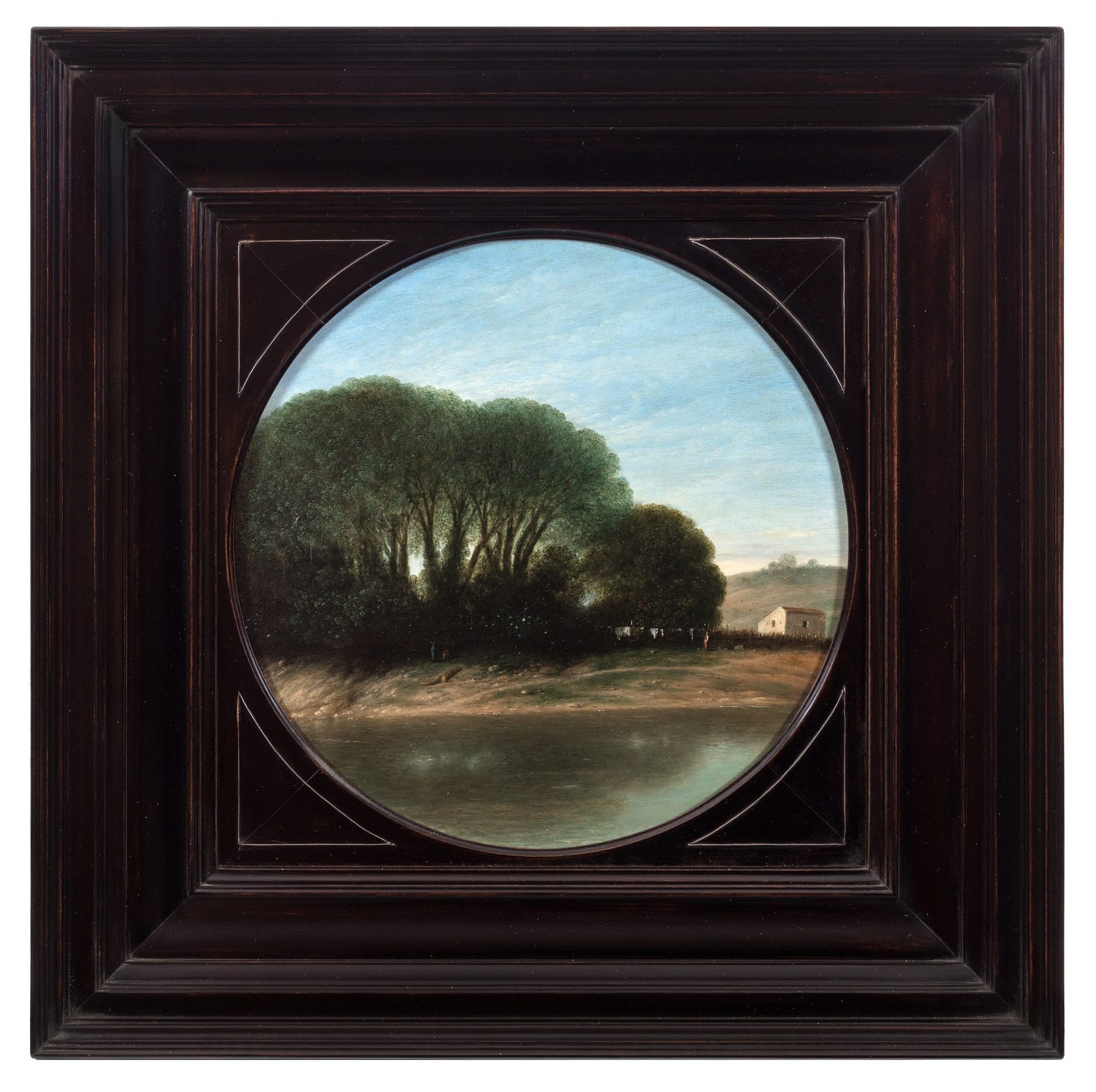 This well-preserved and exquisitely executed painting by Goffredo Wals (also known as Gottfried) depicts a grove above a riverbank. Blurred reflections of the trees, as if seen through a morning mist, flicker on the water’s surface. Laundry is draped over an unassuming fence. The stone building set before a rolling hill serves as an accent that draws the eye towards the light blue cloud-streaked sky. Two small figures, one seated, converse on the steep riverbank; another tends to the drying clothes.