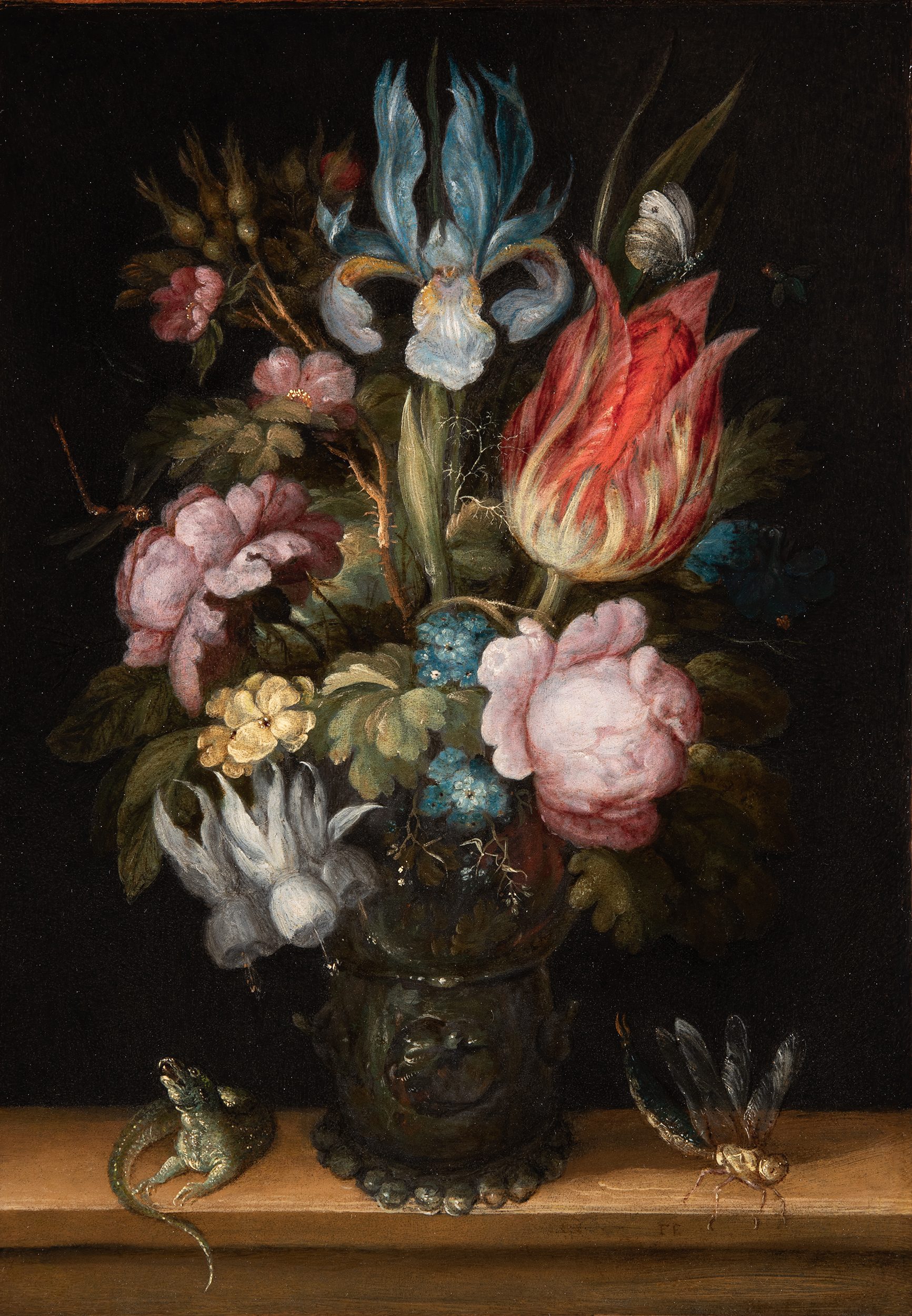 Dated by Dr. Joanneath Ann Spicer to 1620-25, the present work would have been painted shortly after Savery settled in Utrecht, where he spent the last two decades of his life. As seen in other early examples (Liechtenstein GE 789; fig. 1), it is characteristic for him to depict both wild and cultivated flowers – from a tulip, roses and an iris to forget-me-nots, narcissae and primroses – which until 1550, did not appear in gardens in Europe. Above, there is a dragonfly and below, a lizard and a grasshopper. It can be compared to a similar work dated 1621 (Victoria and Albert Museum, inv. DYCE.4; fig. 2). The grasshopper symbolizes both good and bad luck, with the implication that if the insect is badly treated good luck may turn sour, so it serves as a kind of Vanitas. Lizards also have moral overtones. If trapped, a lizard sheds its tail, allowing it to escape, a metaphor for salvation. Such details were common in Dutch still lives and elevated their status to something beyond the merely decorative, something deserving of contemplation and thought. Such flower pieces were considered objects of wonder of the natural world, part of the bounty of the Creator.