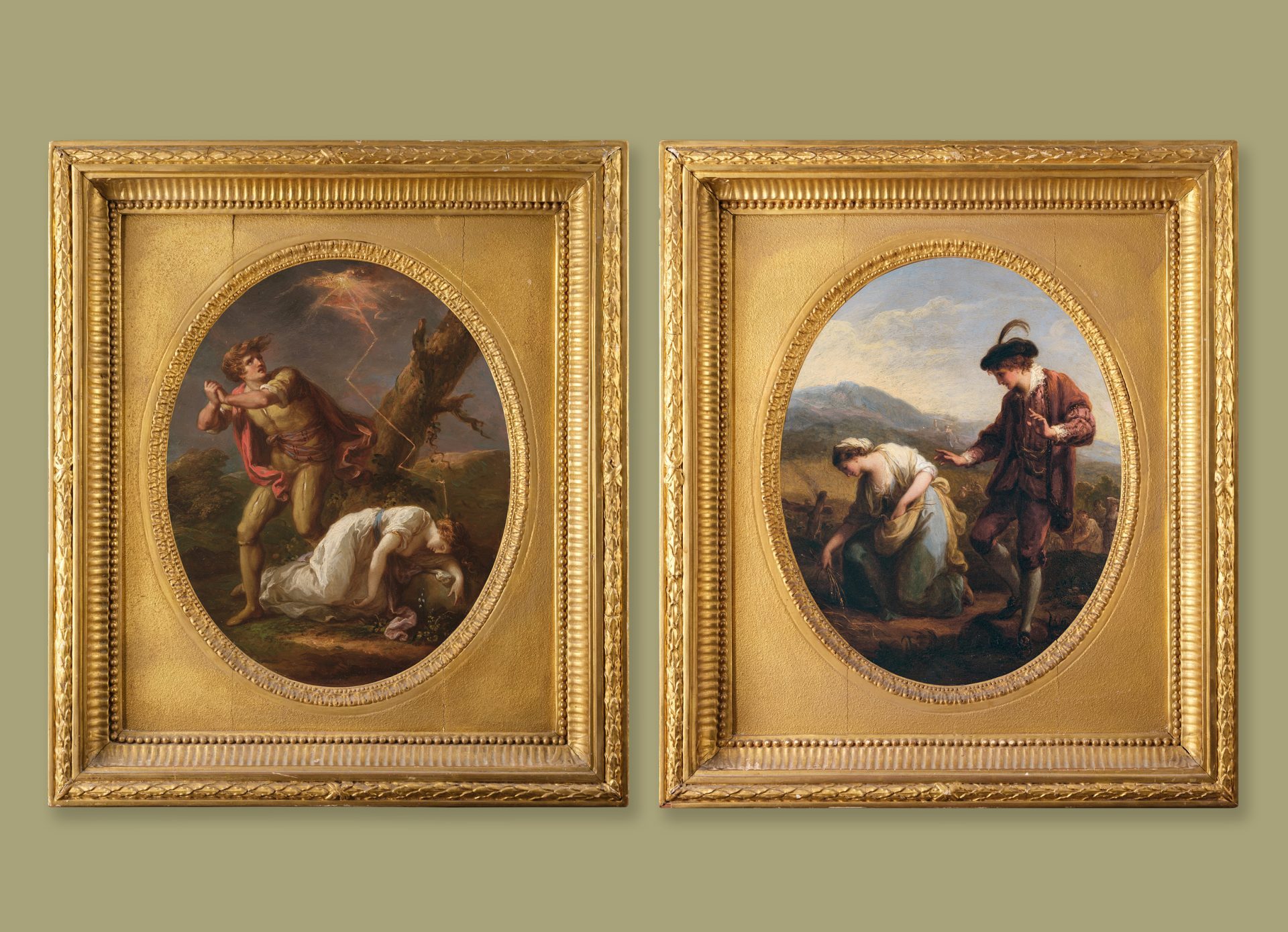 At the same time, both scenes represent two of the four seasons. The lightning struck Amelia with Celadon stands for summer, the harvesting Lavinia with Palemon for autumn. It is obvious that two different ‘Modi’ of painting between major and minor are addressed here, which had already been established in the 17th century with Nicolas Poussin, following musical theory: Palemon and Lavinia represent the mode of the arcadian, Celadon and Amelia the mode of the horrifyingly sublime. The two oval copper paintings were long considered lost. Only recently did they reappear from a private Kenyan collection. Since The Hon. Robert Morgan-Grenville acquired these paintings, presumably at the beginning of the 20th century, they have been passed down within the family without interruption.