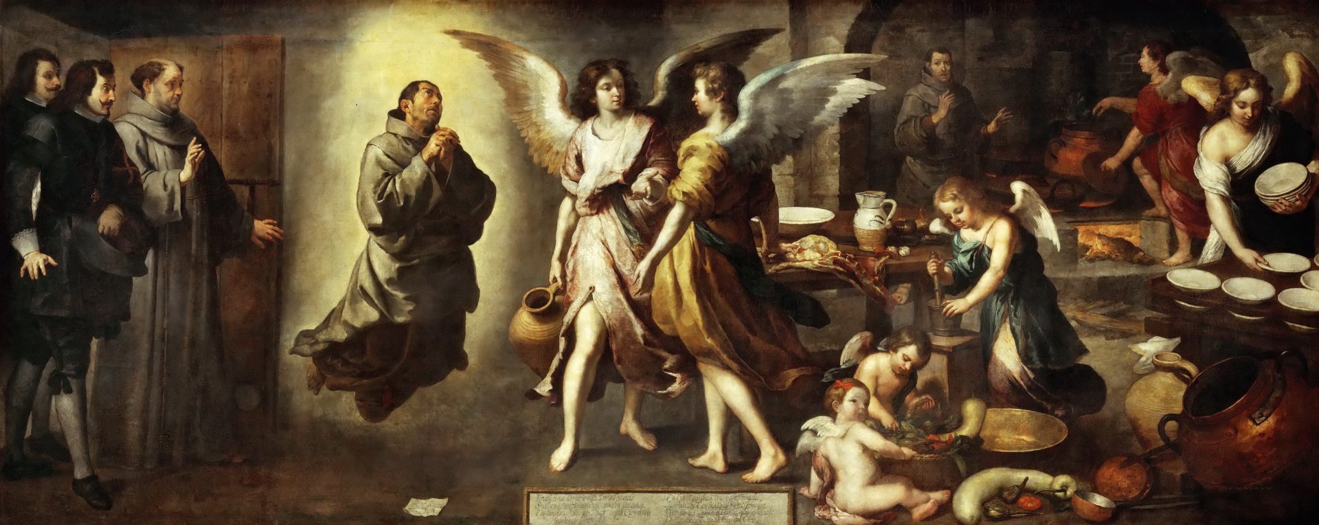 Bartolomé Esteban Murillo Angel’s Kitchen Date 1646 Medium oil on canvas Dimension 180 x 450 cm In the collection of Musée du Louvre, Paris Date 1646 Medium oil on canvas Dimension 180 x 450 cm In the collection of Musée du Louvre, Paris more from this artist The Young Beggar The Virgin of the Swaddling Clothes Self-Portrait Two Women at a Window The Good Shepherd Christ Healing the Paralytic at the Pool of Bethesda The Vision of Saint Anthony of Padua San Juan de Dios Transportando a un Enfermo (Saint John of God Carrying a Sick Man on his Back) Immaculate Conception Angel’s Kitchen The Apparition of the Virgin to Saint Bernard The Virgin and Child with Saint Rose of Viterbo