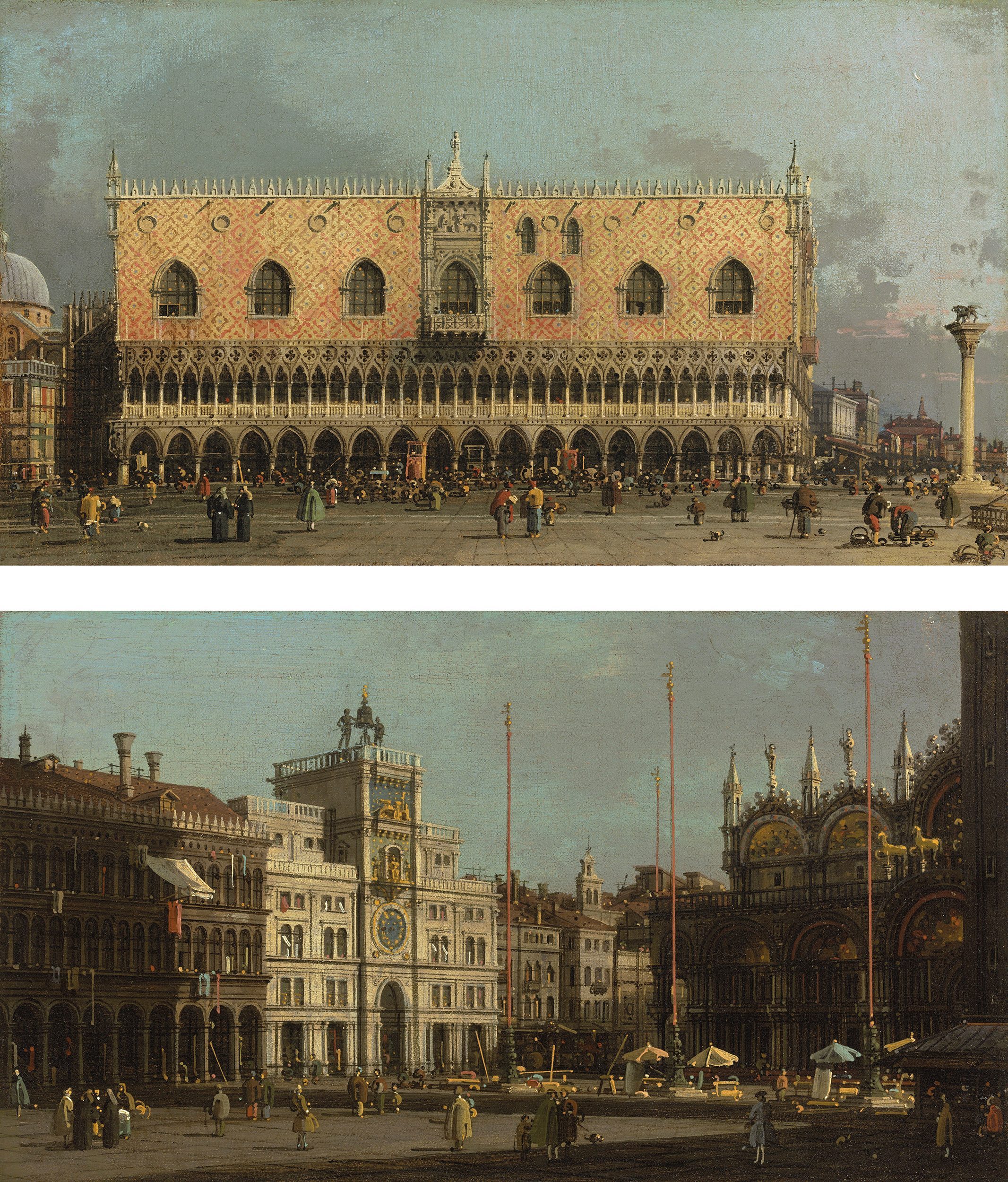 The view of the Piazza San Marco shows, from the left, the eight eastern-most bays of the Procuratie Vecchie, begun in 1513, the Torre dell’ Orologio, designed by Mauro Codussi and finished in 1499 but with the additions completed in 1755, the houses on the northern side of the Campo di San Basso, with a campanile (San Zulian?) behind, the left half of the façade of the Basilica, and, framing the composition, the north-west corner of the Campanile. In the companion picture, the lateral (west) façade of the Doge’s Palace, begun in 1422, is shown with, the south-west corner of the Tesoro of the Basilica to the left with the Porta della Carta of 1438 by the Bon brothers in shadows, the buildings lining the Riva degli Schiavone in steep perspective on the right, and the Column of Saint Mark on the extreme right. As so often with pairs of Venetian views by the artist, the viewpoints are in a sense complementary, as parts of each composition could be seen at different angles from the viewpoints of the other, respectively on a diagonal two thirds of the way across the Piazza and immediately in front of Sansovino’s Libreria. The fall of the shadows indicates that the San Marco view is shown in late morning light, while that of the Doge’s Palace is seen in the afternoon.