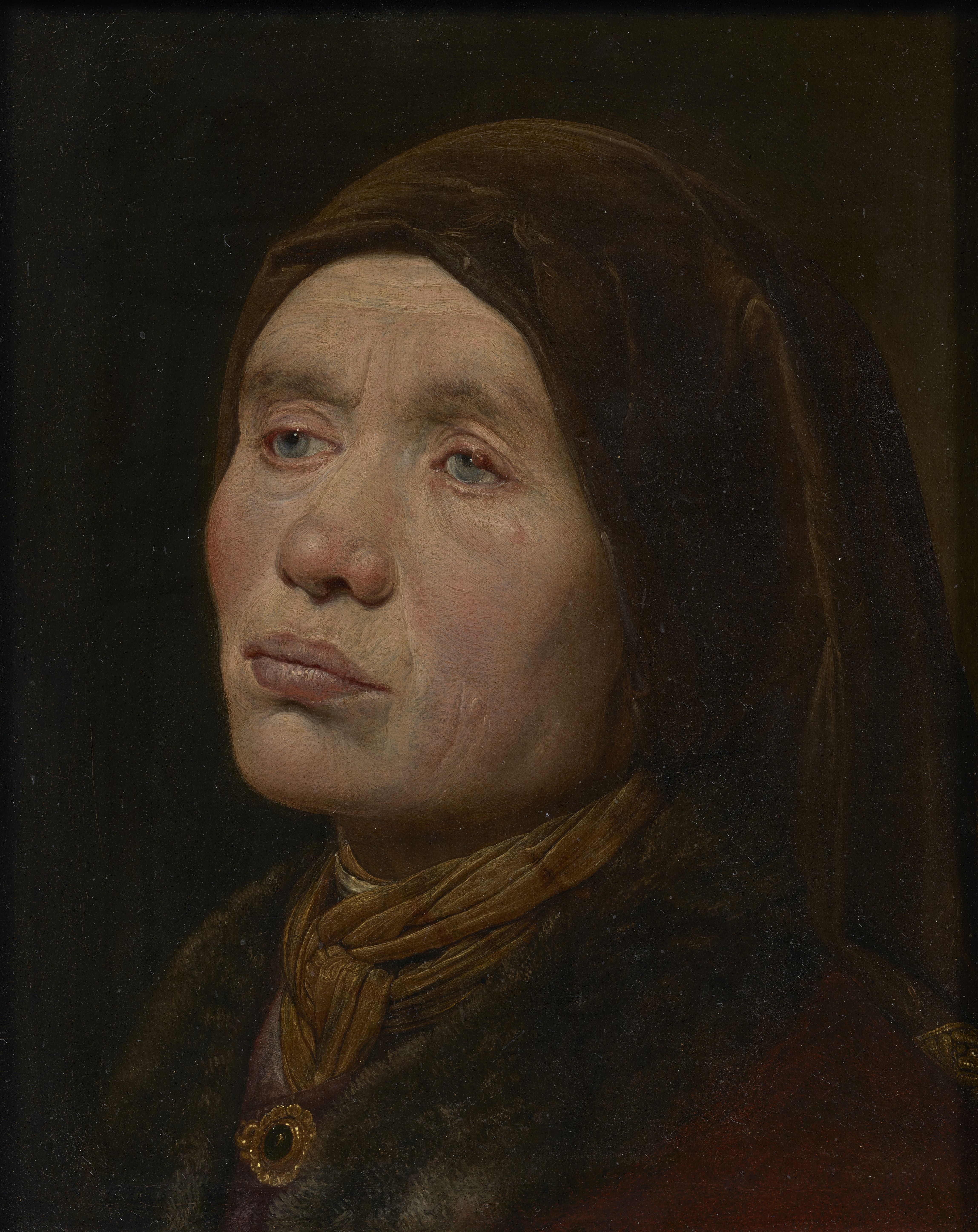 An elderly woman gazes dispassionately to the left. Her glacial eyes catch the light that falls on her furrowed face. One notices the cyst on her left eyelid and the blotchy imperfections of her weathered skin, a testimony to the harsh years she has endured. Yet the gold trim of her headscarf, the striped chiffon coiled around her neck, the glistening gemmed brooch and fox fur-trimmed coat speak to a luxurious lifestyle that betrays her seemingly humble origins.