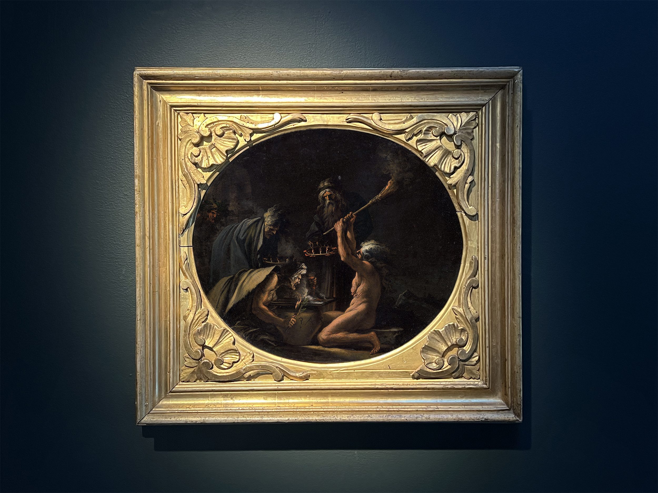 Rosa is believed to have painted the London work for the Florentine banker and collector Carlo De Rossi, who supposedly hung it at the end of a long gallery and concealed it behind a curtain so that it could be revealed theatrically to unsuspecting visitors. A description of a painting matching the present work appears in De Rossi’s postmortem inventory of 1683 and was kept in a room adjacent to the one where that now in London was displayed. Painted on a small copper support with an oval format, this work depicts a mysterious rite performed by three haggard witches and a bearded sorcerer, all hovering around a cauldron and illuminated by candle and torchlight. A fifth figure is shrouded in darkness in the left background. Only his face, hideously etched with terror and rage, is visible. The figure of the elderly naked witch with wild hair, flaccid skin, and sagging breasts in the right foreground appears in all of Rosa’s paintings of witches’ sabbaths, and features as the subject of the Uffizi work mentioned above.❖
