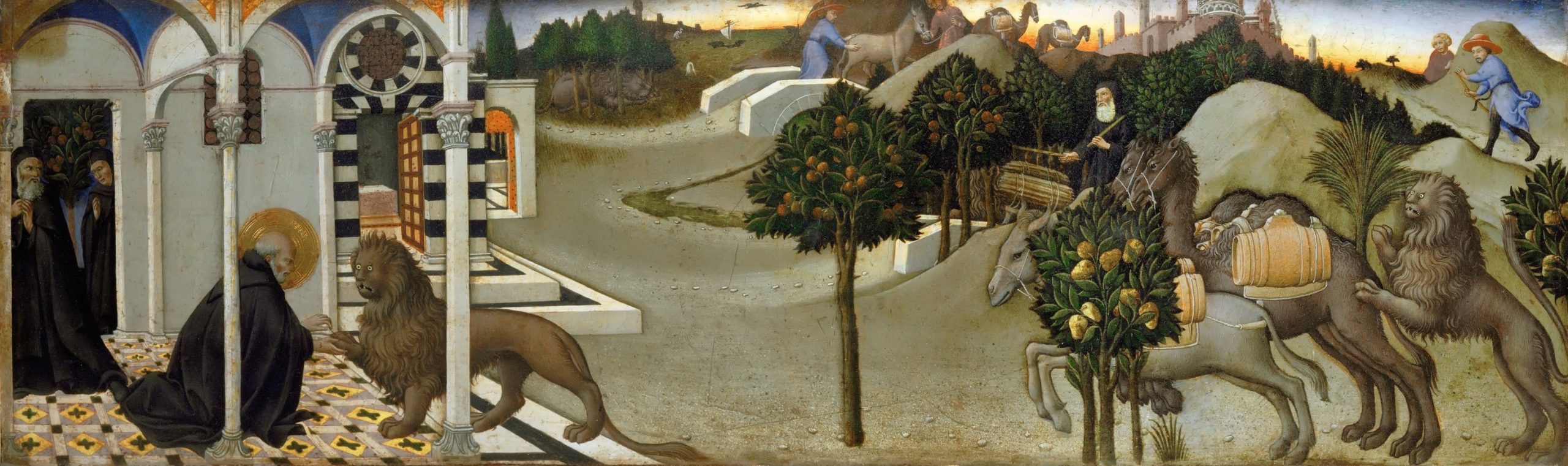 Sano di Pietro Scenes from the Life of St. Jerome Date 1444 Medium tempera on panel Dimension 23 x 78 cm In the collection of Musée du Louvre, Paris Date 1444 Medium tempera on panel Dimension 23 x 78 cm In the collection of Musée du Louvre, Paris more from this artist Scenes from the Life of St. Jerome The Adoration of the Shepherds with Saints John the Baptist and Bartholomew San Bernardino Preaching in the Piazza del Campo Madonna and Child (‘Madonna del Pilastro’) Birth of the Virgin; Stories of the life of the Virgin Virgin of the Assumption with Saints Mass of Saint Anthony Abbot Christ Carrying the Cross Saint Anthony Abbot Tormented by Demons Virgin and Child with Saints Jerome and Bernardino of Siena and Six Angels Meeting of Saint Anthony and Sant Paul Resurrection Madonna and Child with St Jerome Bernardino John the Baptist Anthony of Padua and two Angels Saint Anthony Abbott Tempted by Gold