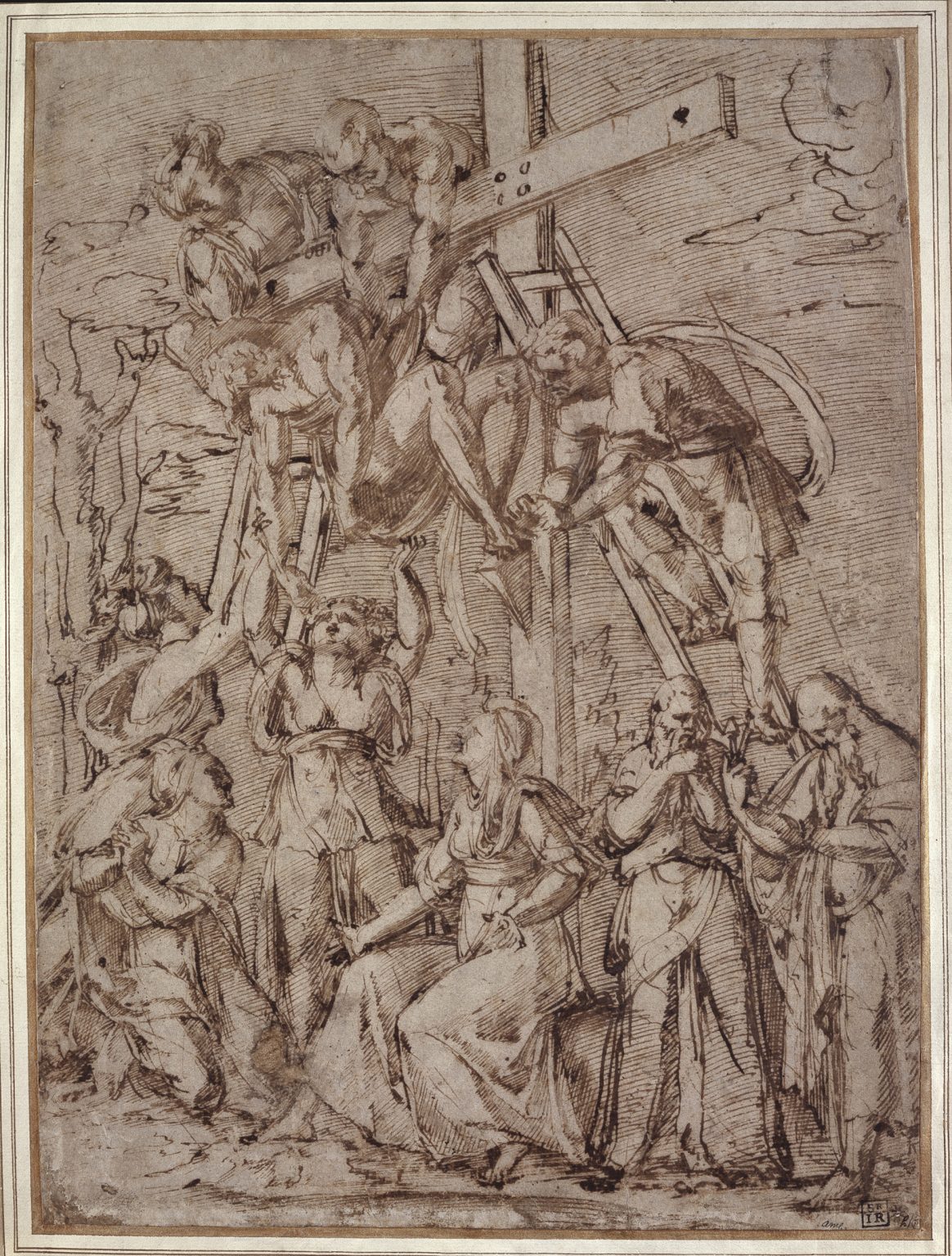 A possible source for Bandinelli’s composition is the large altarpiece by Filippino Lippi in the Church of Santissima Annunziata in Florence, a painting which influenced a number of artists, including Rosso Fiorentino[4] and Raphael. The latter’s design of 1520-1 was engraved by Marcantonio Raimondi,[5] and contains several parallels with the present drawing. All the above-mentioned derivations from the Lippi Deposition share the frieze-like disposition of figures around the Cross and the plain, flat backgound. Such an arrangement seems to have its origins in the work of Northern artists of the previous century.