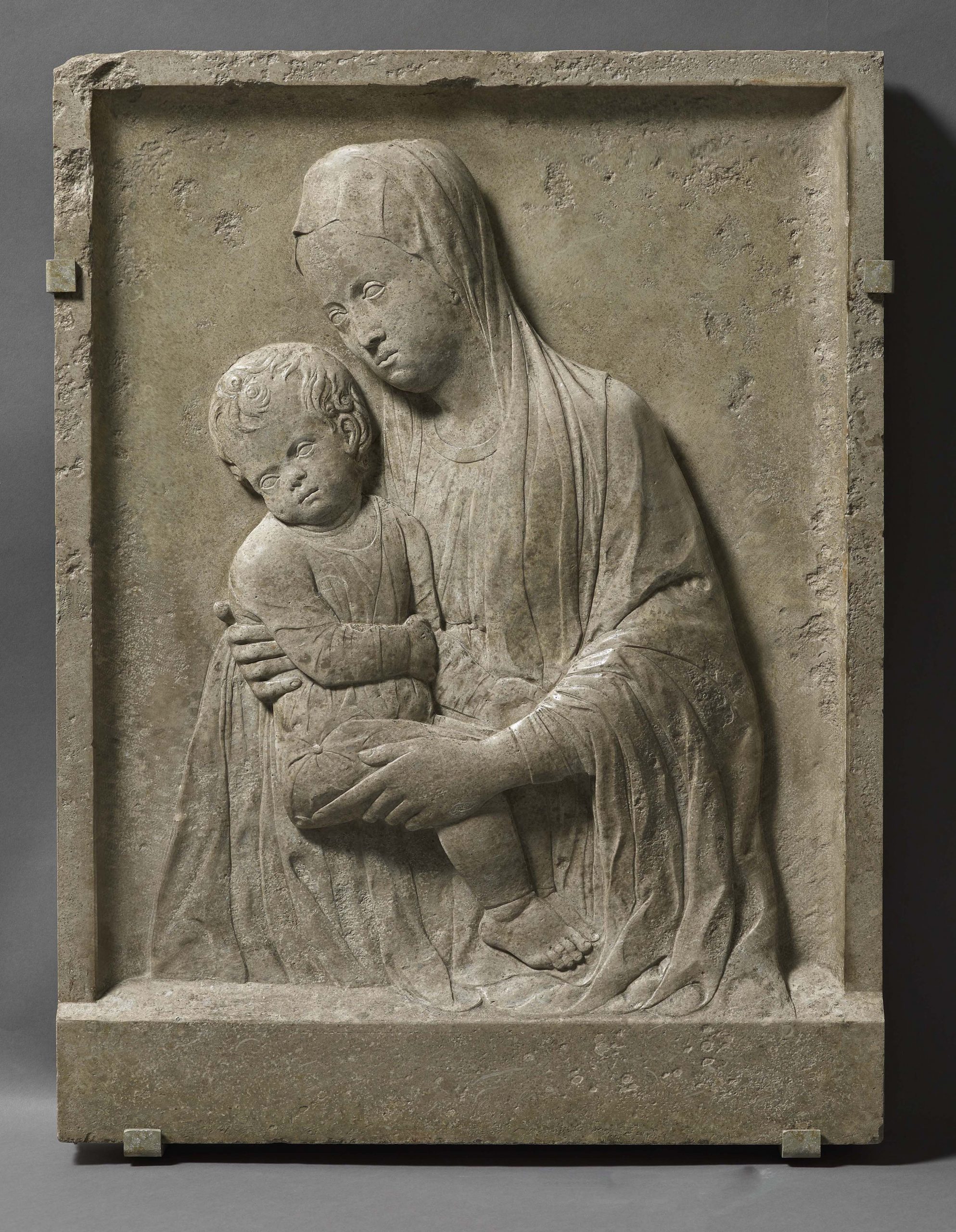 Capturing the subtle interplay between line and three-dimensional form, Virgin and Child is an extraordinary refined low relief by Antonio Rizzo, a leading sculptor in 15th century Venice and the main competitor to Pietro Lombardo’s family workshop. Reliefs representing the Virgin and Child are usually associated with the Florentine Renaissance and models by artists such as Ghiberti and Donatello. The present work differs from these by the treatment of its shallow relief, set off against the background, the rounded faces, sharply delineated lips and arched brows, which are distinctive of a number of sculptures attributed to the artist.