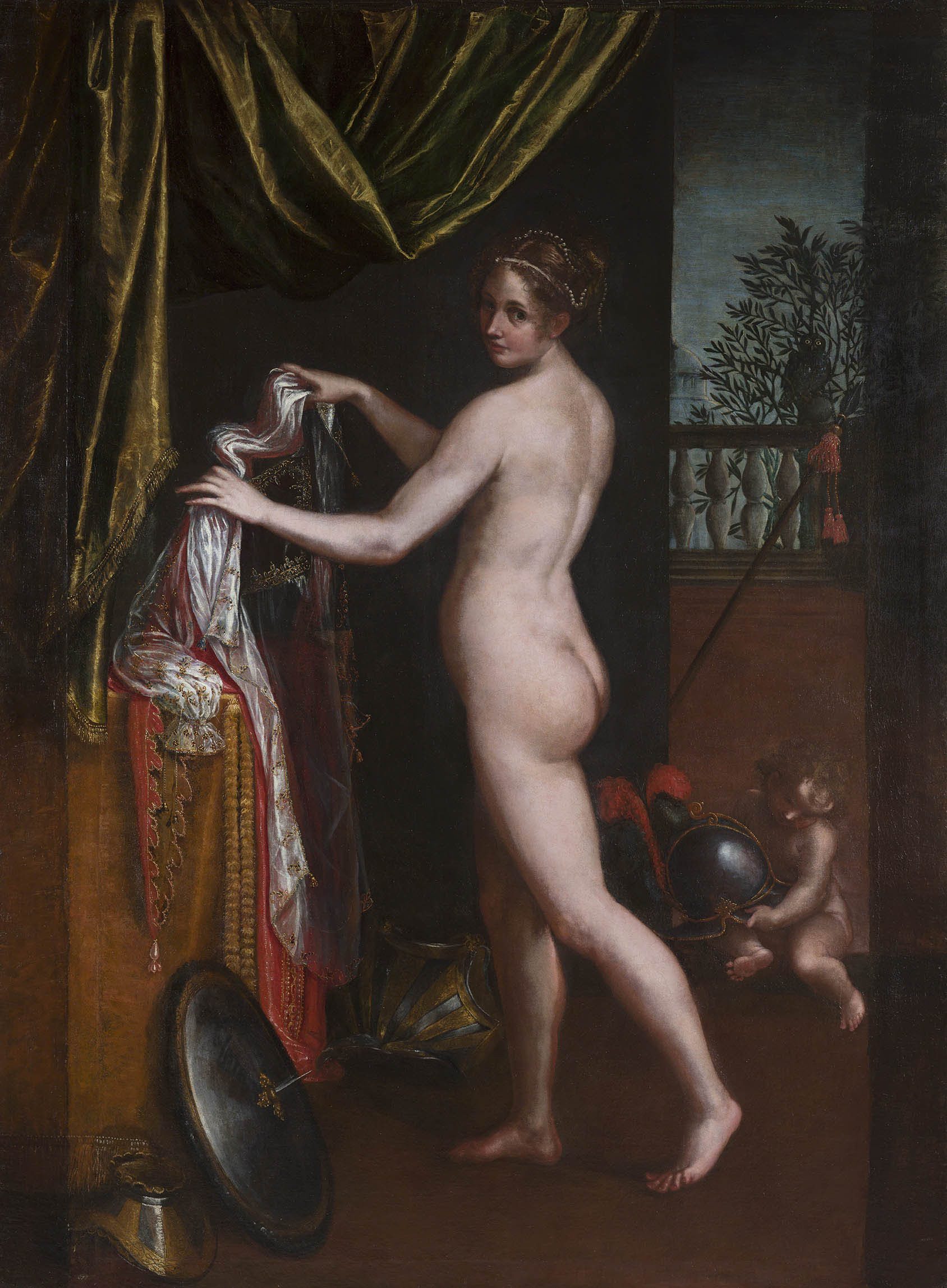 It might seem inevitable that Lavinia’s career would advance as her father’s declined. Yet It is also important to understand how truly independent she became, not allowing herself to be a mere follower or a collaborator, by establishing her own reputation and market. She was not merely the daughter of a painter, but herself a painter who had the force and talent to exploit the extraordinarily stable social circumstances and education her family provided, and contributing to this in return. This independence was further manifested in her paintings of nude female figures in her later years, such as the Minerva Dressing for Cardinal Scipione Borghese in 1613 (fig. 29; itself a reworking of the earlier version from ca. 1604, for Marco Sittico Altemps), or the recently discovered Three Graces, even if these were primarily based on ancient example like those statuettes in her early studio rather than the posed model. It further led her to exploit and embrace her gender by portraying herself as Venus or a brave Judith, dressed in a fine and bejewelled costume.[56] This she did not learn from Prospero.