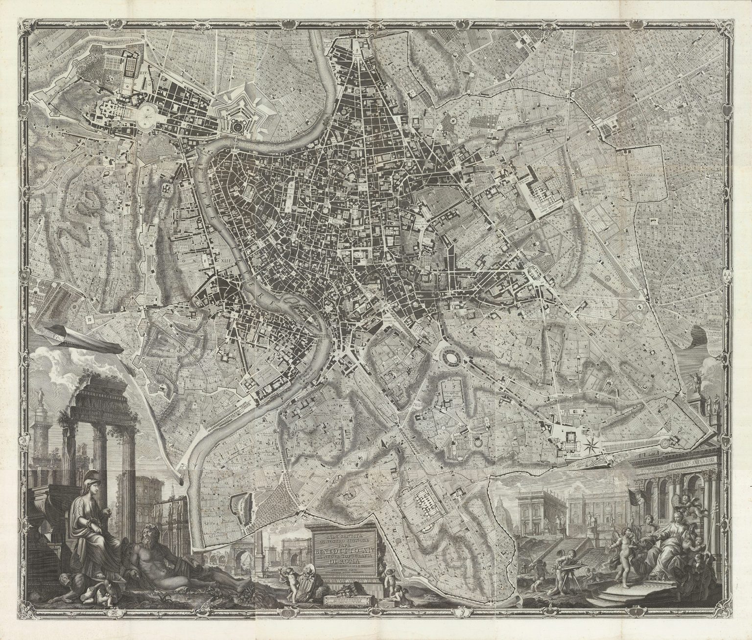 Nolli’s map is famed for its departure from the frequently produced ‘view-map’, which portrayed the city with a bird’s eye view. Rather, Nolli’s map is a ‘plan-map’, specifically a ‘figure-ground plan’ map, where all public and semi-public spaces are shown in white, emphasizing the diverse nature of the city during the 18th century. Inhabited areas are shaded, a feature which displays the population density of the city at the time. While this map of Rome is not the first of its kind, as Leonardo Bufalini (1486/1500–1556) created a similar type of map in 1551, Nolli’s map went far beyond Bufalini in its attention to detail and more precise measurements (Vatican Library, VcBA 11052240). Additionally, Nolli was the first to orient the city to the north as opposed to the east, as had been done by previous cartographers. Engravings representing Ancient and modern Rome designed by the painter Stefano Pozzi decorate the outer parts of the map, adding visual embellishment to Nolli’s purely topographical depiction of the city.