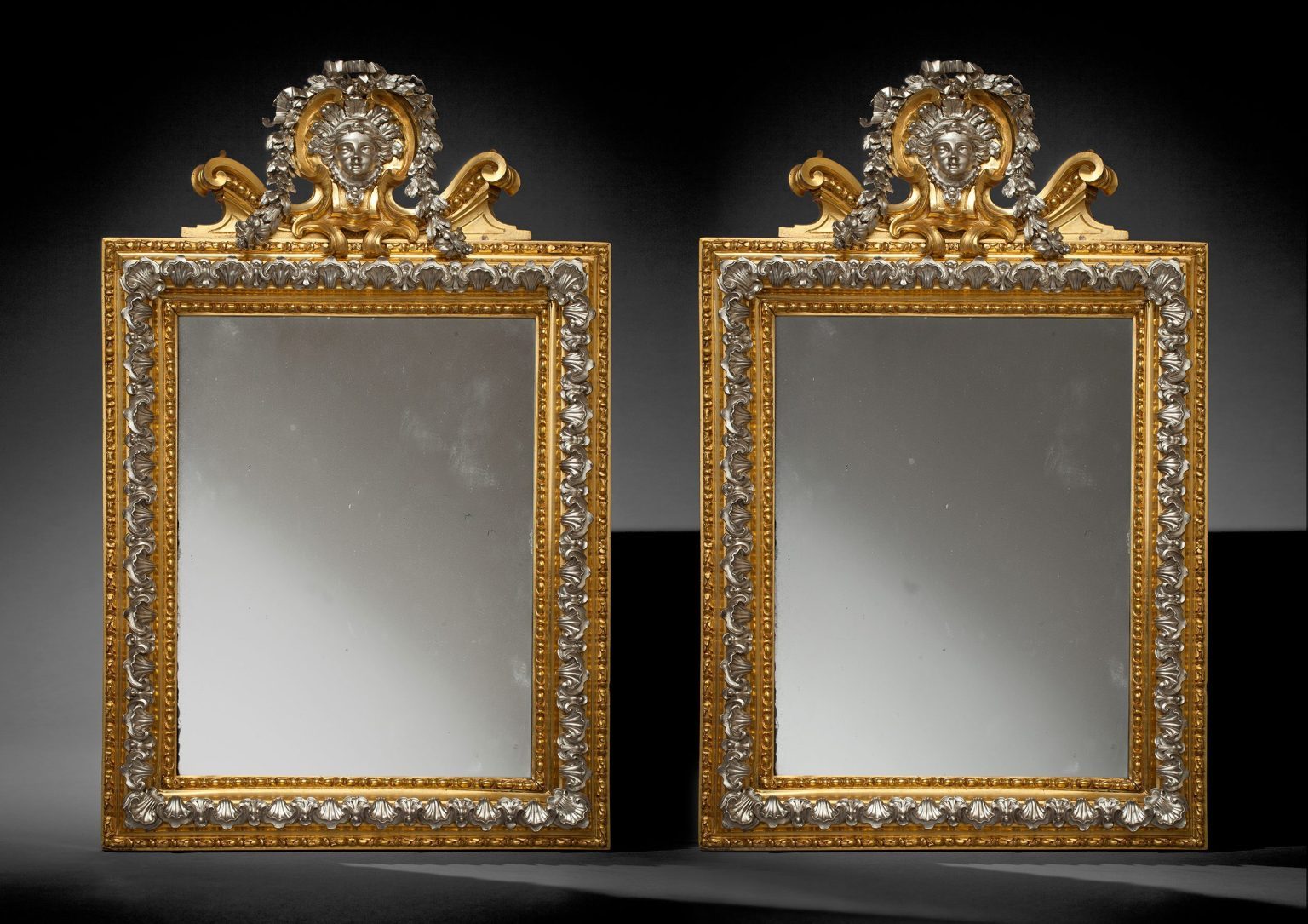 These two superb gilt-bronze and silver mirrors reflect the degree to which artists and craftsmen of the highest order came to work in Rome during the 18th century. Decorated with a border of exquisitely wrought silver seashells mounted on a gilt-bronze frame and topped with cartouches in which are a female head in silver over which falls a wreath of laurel, these are intended as luxury objects. Even the tiny screws which attach the hand-chiseled gilded backplate to the back of the mirror are carefully shaped, as eight-pointed stars. The mix of gilt bronze and silver is characteristic of the Roman High Baroque, and these mirrors are typical of the production of silversmiths in Rome between Giovanni Giardini (1646-1722) and Luigi Valadier (see cat. 25).