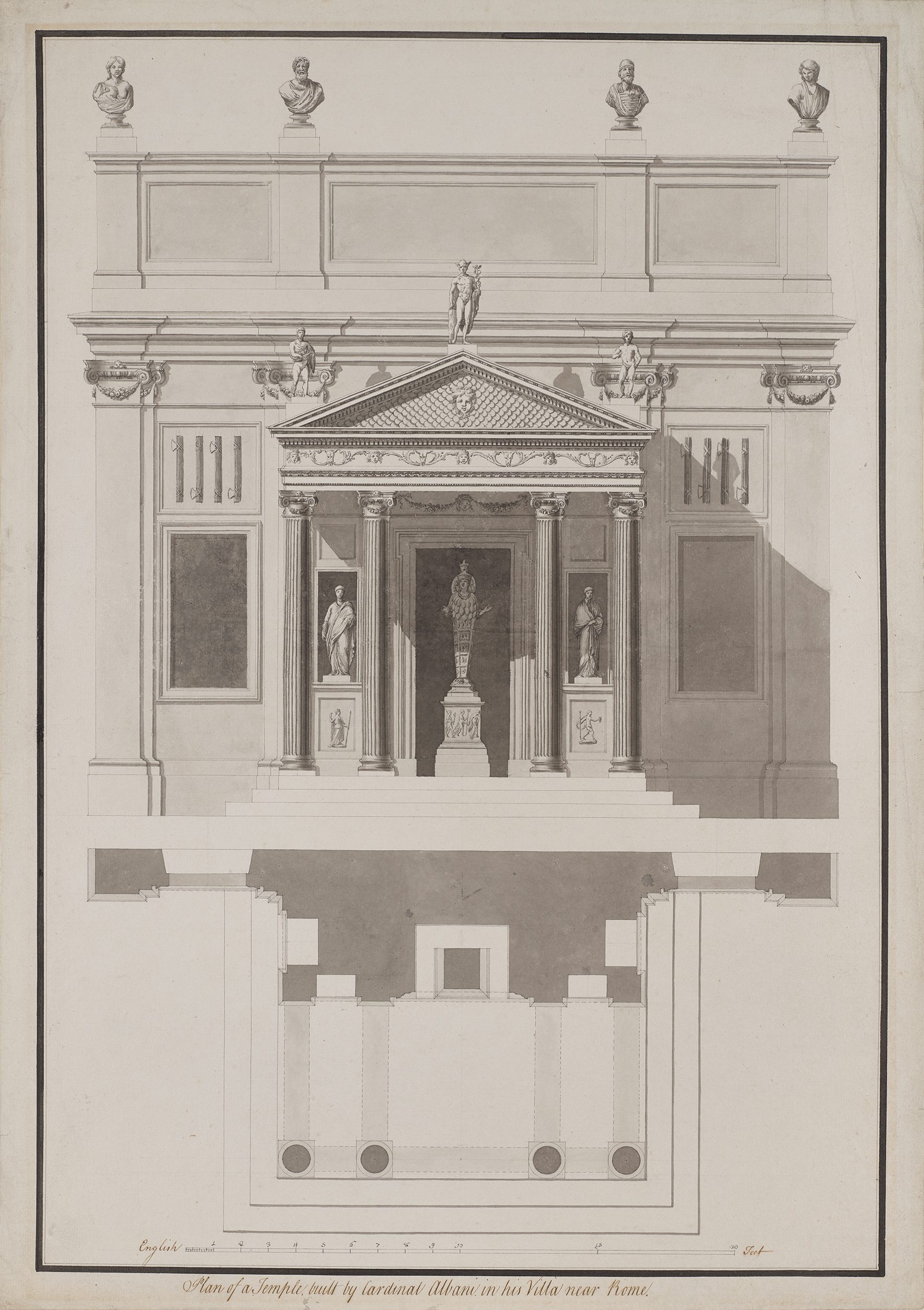 James Byres had arrived in Rome in 1758 to train as a painter, although his first success was in architecture, for which he was awarded a prize in the Concorso Clementino at the Accademia di San Luca in 1762. Byres oversaw the production of large, elegant architectural drawings, a staple Grand Tour purchase.[2] The present sheet, labelled ‘Plan of a Temple bult by Cardinal Albani at his Villa near Rome’, and with a scale in ‘English feet’, is executed in elegant, controlled washes.