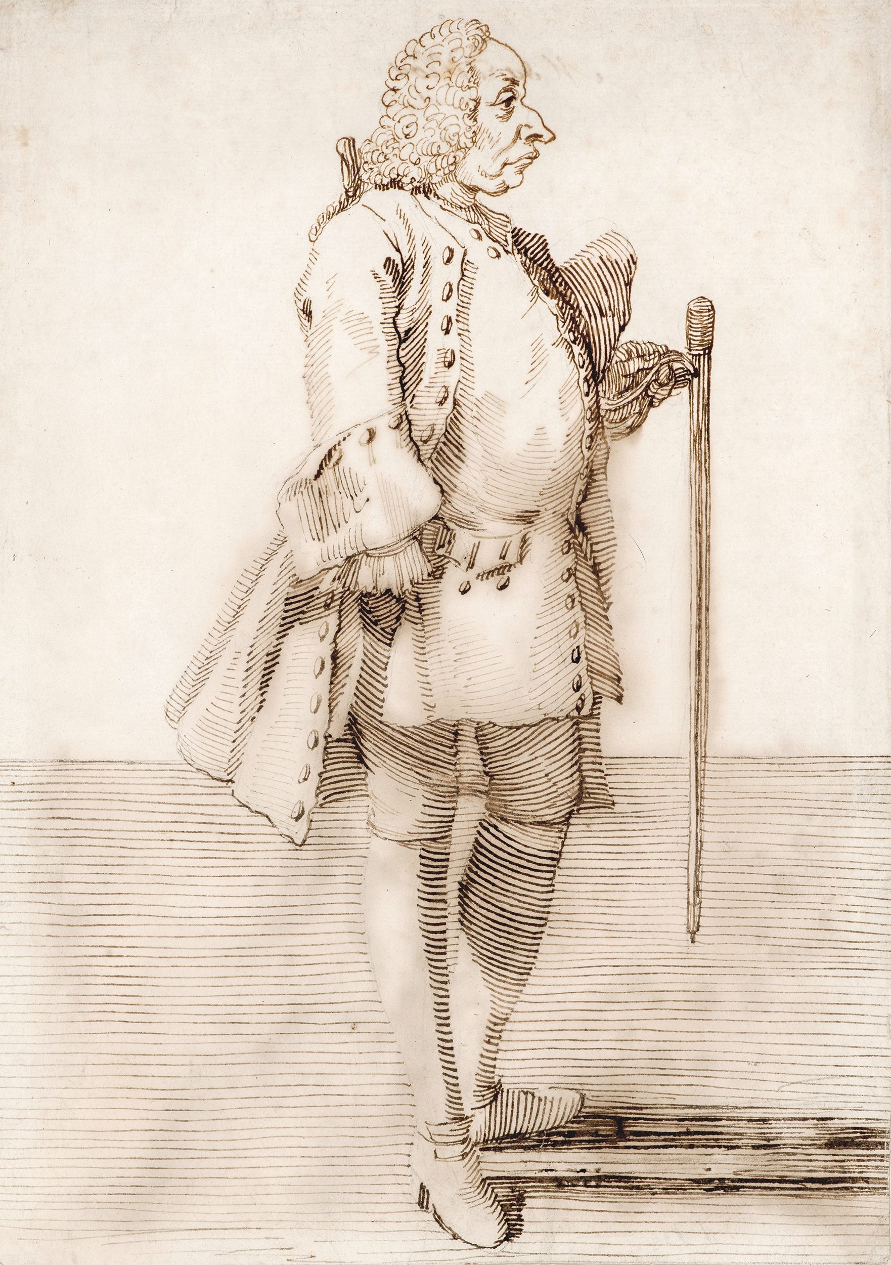 The caricature as an art form has its origins in drawings by Leonardo da Vinci. His grotesque drawings were widely copied by Milanese and Northern artists. In the late cinquecento Annibale Carracci and Guercino independently produced what we would call caricatures, a term invented by Filippo Baldinucci in 1681 who describes them as ‘increasing the load (‘carico’ in Italian)…a manner of portraying a sitter in as true a fashion as possible to the sitter’s true features, yet in jest or even in scorn they add or exaggerate the sitter’s flaws, imitating them out of all proportion, in such a wise that the sitter looks like himself in the picture as a whole, but is changed in his individual parts’. At around the same time as Ghezzi’s famous satirical drawings were being made, Giambattista Tiepolo and Count Antonio Zanetti (1680–1767) were making similar drawings in Venice.