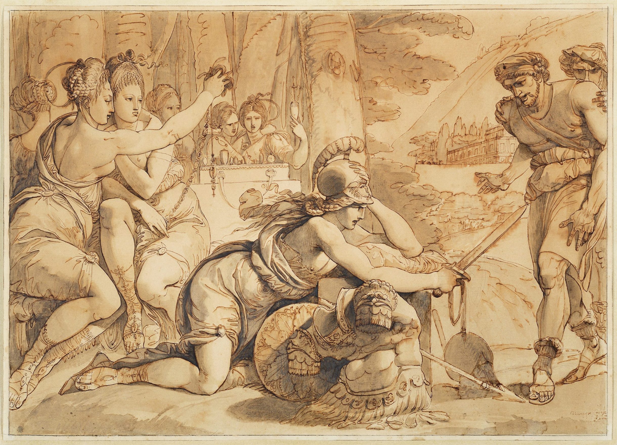 This highly finished drawing was intended as a collectible object in its own right and was originally part of a suite of pen-and-ink drawings, some heightened with white, depicting scenes from Greek history and Homer’s Iliad. Represented here is the moment when Achilles—disguised as a girl by his mother, Thetis, in order to protect him from meeting his death in the Trojan War—is tricked by Ulysses into revealing his true identity. Having found a sword and shield packed among a trousseau of more feminine gifts, Achilles instinctively grasps the weapons, unmasking himself to Ulysses, while the true daughters of Lycomedes contemplate the jewels and trinkets.