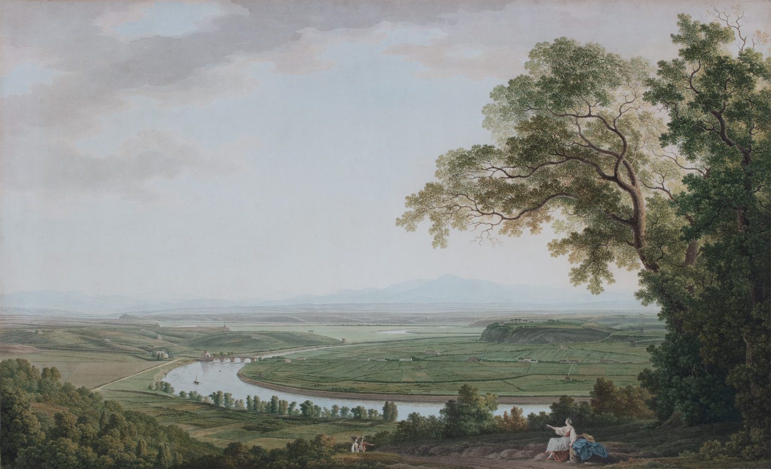 This monumental watercolor, a major work from Lusieri’s Roman period, shows the Tiber valley seen from the park of the Villa Mellini located on the heights of Monte Mario looking northward to a long stretch of the Via Flaminia crossing the Ponte Milvio in the middle ground of the composition, with the limestone ridge of Monte Soratte emerging in the blue mists of the horizon. A seated figure beneath the framing trees at the right gives scale to the composition and directs the viewer’s gaze to the river as it makes its way downstream to Rome, in a great serpentine curve, across the vast valley. This view, unique in the artist’s oeuvre, records the last stage of the journey made by many Grand Tour visitors before entering the Eternal City which reveals itself spectacularly from the top of Monte Mario, a pendant view of which Lusieri recorded in a similarly scaled watercolor of 1779, the first of four versions, the most famous of which is today in the Akademie der Bildenden Künste, Vienna (GG-403; fig. 1).