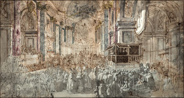 The present drawing depicts the Mass of the Annunciation which took place each year on the Feast of the Annunciation on 25 March at the church of Santa Maria Sopra Minerva. The Pope, assisted by two Cardinals, the Confraternity of the Annunciation and their retinue, blesses alms and gifts to be bestowed as dowries for the future nuns, poor unmarried girls, who wear virginal white veils. King Gustavus III of Sweden (1746–1792) attended just such a ceremony in 1784, which was recorded in the pages of the Roman weekly record of society gossip, the Diario Ordinario also known as Cracas. Gustavus attended a number of papal ceremonies during his stay in Rome between 24 December 1783 and 19 April 1784, but the Feast of the Annunciation as meticulously described by the Diario Ordinario is the one that comes closest to the event illustrated in this drawing, with the nuns-to-be kneeling left and right, the Pontiff, Pius VI, in triple tiara, cope and crozier accompanied by two cardinals and the deputies of the Confraternity gathered in the center. To the left, on a platform, King Gustavus watches the ceremony. There is an unusual feature, however, which is that the proceedings have been transposed from Santa Maria sopra Minerva to the French titular church of San Luigi dei Francesi.