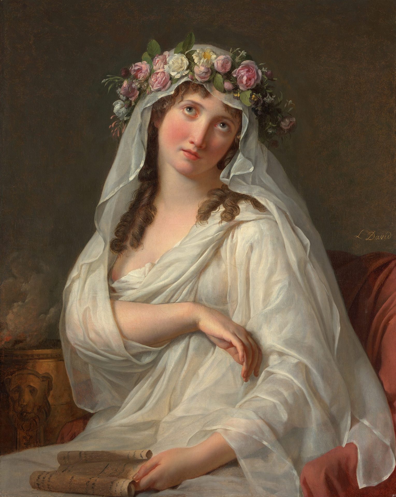 The painting always elicited questions: Its date and its subject in particular have not always been agreed among historians. Usually considered an early work—painted before the outbreak of the French Revolution, it has been dated as early as 1785 and as late as 1795. It is nowadays widely accepted that its likely date is 1787. This however does not explain all the singularities of the painting. Unfortunately, nothing is known of its genesis. Its size and polished execution suggest an important commission. Because of its mention in David’s list of autograph paintings along with a Psyche of similar dimensions, the two pictures have been paired even though the first mention of the Psyche in David’s correspondence goes back only to 1795. As noticed by Guillaume Faroult, the subject and style of the Psyche point to a date posterior to 1787 (2011, loc. cit.); it was in all likelihood painted while David was in jail from 1794–95, yet still able to receive models. If juxtaposed, the two paintings form an uneasy pair—for reasons beyond the sharp contrast between the austere nude (Psyche) and the diaphanous and billowing folds of the Vestal’s dress. What the paintings have in common, however, is their relationship to the academic exercise of the Tête d’expression taught at the French Academy. Seen as a single painting rather than as a pendant, the Vestal presents a different set of questions. It has been suggested that it is a portrait of a famous actress, Mademoiselle Raucourt (1756–1815), known for her beauty, her stage performances and her involvements with erotic partners of both sexes. Augustin Pajou executed her bust, now in a private collection, flattering and idealizing his subject. More realistic perhaps is her portrait by Adèle Romany, where her features appear somewhat coarser (Musée du Comédie-Française, I0076). Neither image, however, could either confirm or deny her identification as the model for David’s Vestal. Furthermore, the representation of a notorious actress as vestal would be, if not outright comical, at least inappropriate. One could also wonder if David could have been close to an actress whose royalist convictions led her to spend time in prison at the outbreak of the French Revolution.