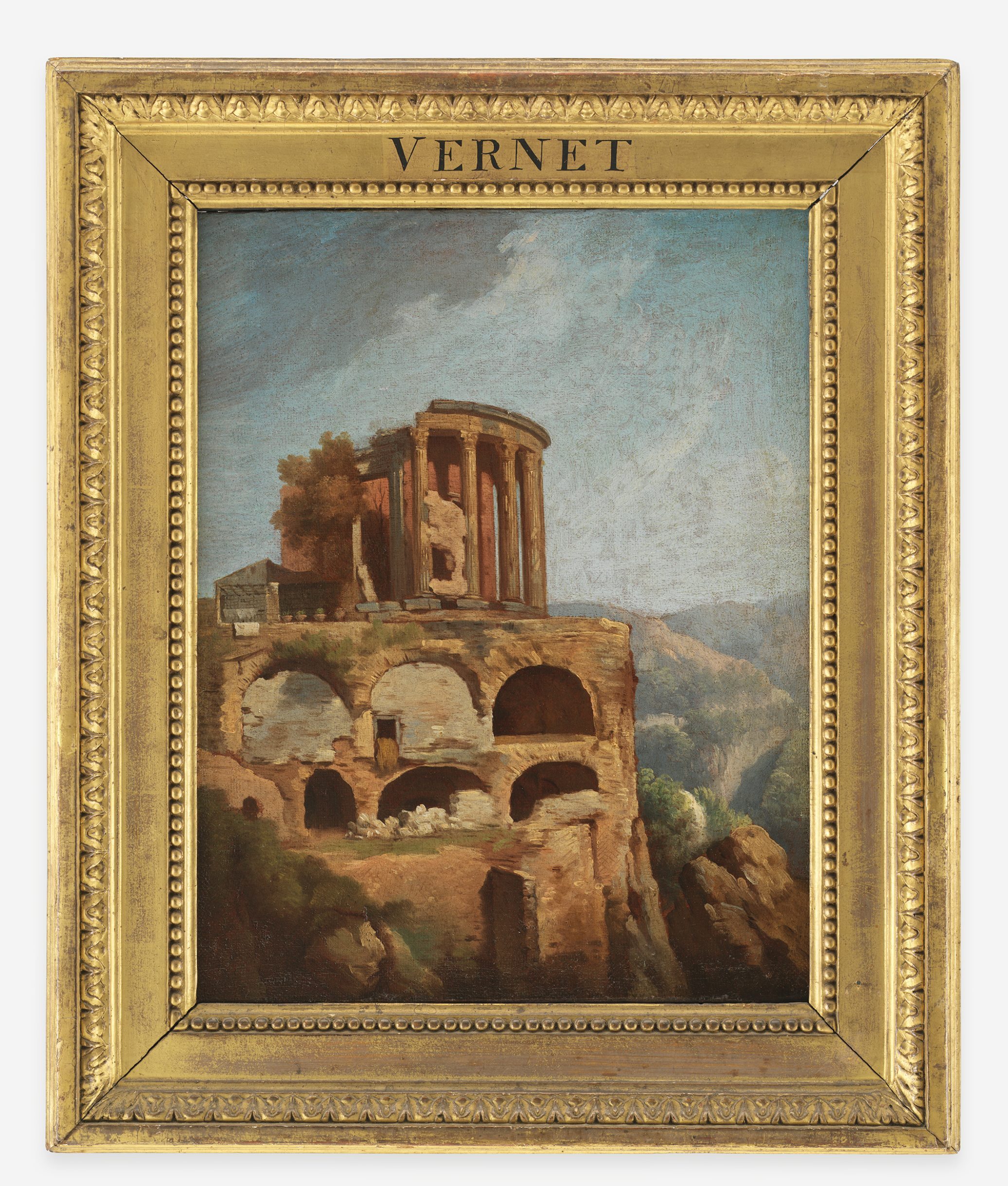 In this fresh and painterly oil study, Vernet has given prominence to the Temple itself, which stretches above the distant, hilly horizon, silhouetted against the sky. He includes, as he does in many of his studies and sketches of the site, the arcaded substructure, evidence of his interest in archaeological sites. His palette relies on tones of rust, ochre and sienna to describe the Temple and the promontory on which it stands, surrounded by scrub brush, while the sky and hills are described in cool tones of blue, green, violet and silver. The rough weave of the canvas lends texture to the painted surface, while the forms are recorded in brushstrokes that are painterly yet faithful to nature.