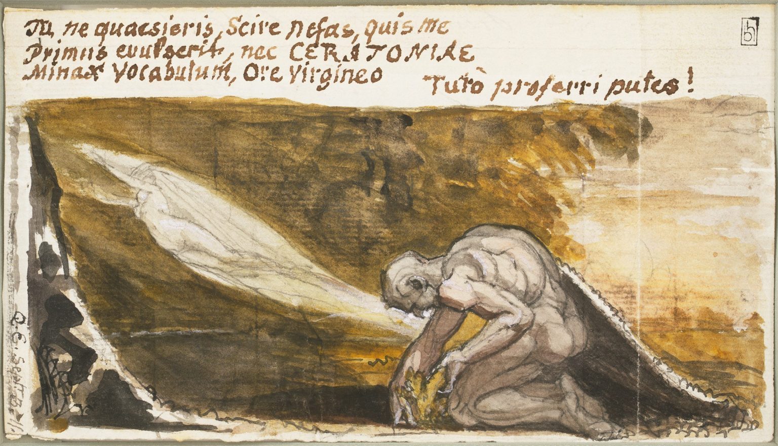 But this interpretation is complicated by Fuseli’s Latin inscription. This may be a quotation or literary allusion but if so, its source for the most part is not obvious.[3] It translates as: ‘You, do not ask, for it is not permitted for you to know, who first uprooted me, nor should you think that the menacing word CERATONIAE, can safely be uttered by a virginal mouth’. ‘CERATONIAE’ appears to be derived from ceratium, the Latin word for carob tree, but why it should be menacing remains obscure.[4] So, while the reference to ‘uprooting’ may allude to the Prometheus myth of creating humans from the earth, the inscription as a whole and the reference to a carob tree do not fit neatly with this interpretation. Indeed, it is notable that although Fuseli depicted the subject of Prometheus in a handful of drawings around this period, these other works focus on the much more familiar and easily readable myth in which the Titan was punished by Zeus for stealing fire by being chained to Mount Caucasus (see for example Prometheus and Io, ca.1800–10 [1965–68] and Prometheus Secured to Mount Caucasus, ca. 1800–10 [1965–80], both Auckland Art Gallery).