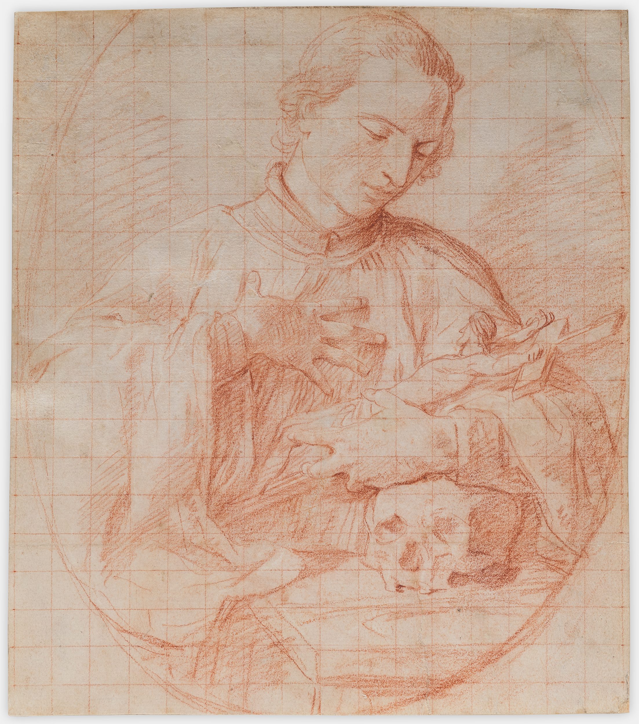 We see in this sheet Batoni’s adherence to the traditions of Carlo Maratti (himself a delicate draftsman, especially in red chalk) and the Roman Grand Manner. This drawing shows the composition at an advanced stage, and we may assume was itself drawn from studies from life. Our drawing is executed in red chalk, a medium frequently employed by Pompeo Batoni. The sheet is squared for transfer to the larger format of the actual painting and differs from the latter in that the lilies on the stone ledge have not here been included. Such squared drawings were typical of Batoni’s practice at this date as seen in the sheet of studies for Saint Bartholomew of ca. 1740-43 now in the Art Institute of Chicago (2013.894), the Study for ‘The Visitation’ of 1736-37, National Gallery of Scotland, Edinburgh (D1940) and the Study of Mercury in this exhibition (see cat. 9).❖